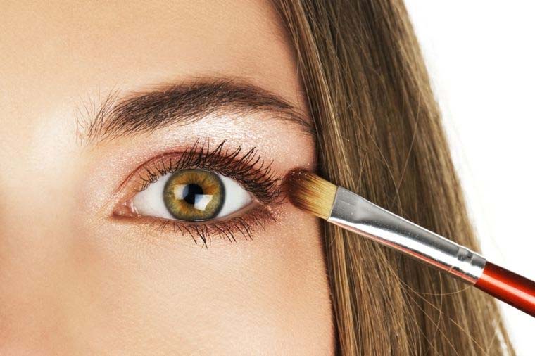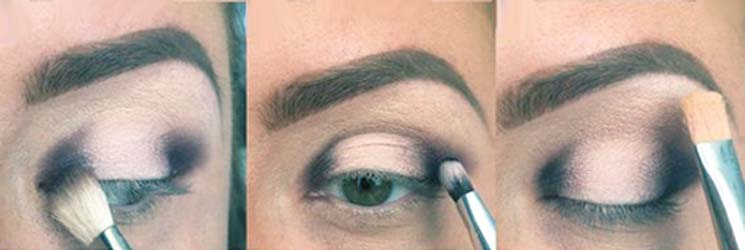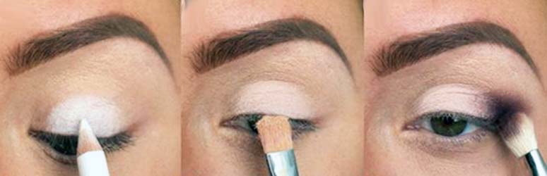 - Na górną powiekę przy zewnętrznym kąciku oka nałóż ciemnobrązowy cień.