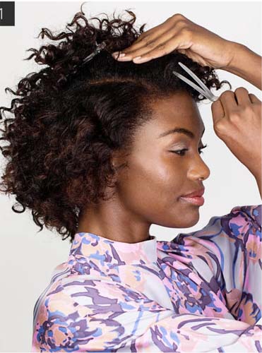 Tworzymy przedziałek na linii, na której kończy się nasza prawa brew. Najłatwiej będzie nam go wykonać za pomocą grzebyka ze szpikulcem. Będzie on szczególnie pomocny, gdy nasze włosy długie są bardzo gęste i się kręcą. Włosy które pozostaną na środku podpinamy podłużną spinką.