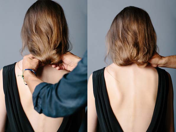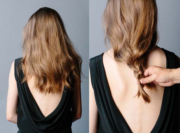 Zaczesujemy włosy na gładko. Żaden włos nie może być splątany, gdyż utrudni to wykonywanie dalszych kroków. Wszystkie pasma, który znajdą się poniżej linii ramion zaplatamy w krótki warkocz.Warkocza nie wiążemy żadną gumką.