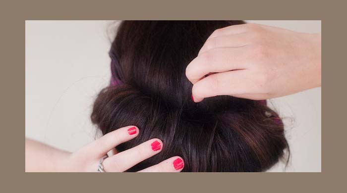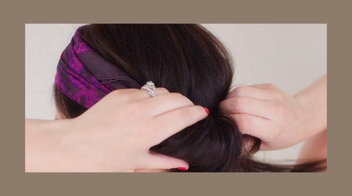 Powoli zacznij zwijać pasma swoich włosów, a następnie przekładać je przez chustę. W efekcie wszystkie pasma, z obu stron głowy, powinny owinąć się wokół bandany.
