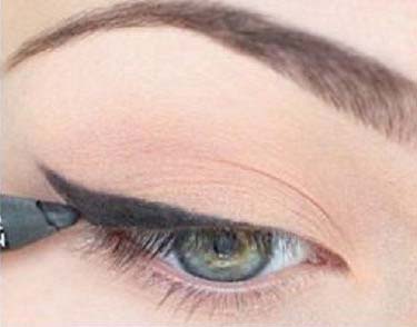 Przy pomocy czarnej kredki do oczu rysujemy na górnej powiece kreskę. Powinna być ona wyciągnięta ku brwiom. Kończyć się zaś powinna na środku linii rzęs.