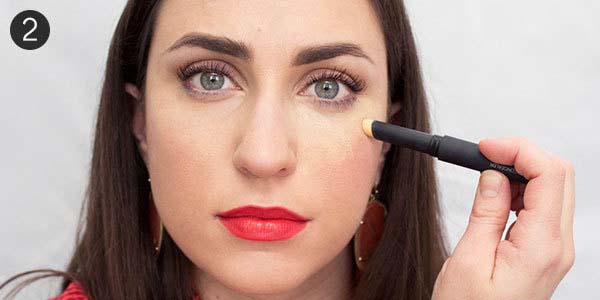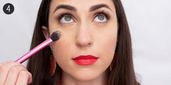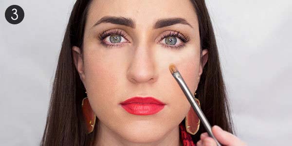 Teraz czas na nałożenie korektora pod oczy. Jego kolor dobieramy w zależności od koloru cieni. Jeżeli mają one chłodny odcień szarości i błękitu, to używamy korektora w odcieniu moreli. Jeżeli mają nieco cieplejszy odcień brązu dla równowagi przykrywamy cienie chodnym odcieniem różu. W przypadku bardzo ciemnych cieni powinnyśmy używać beżowych, lekko żółtawych korektorów. W tym ostatnim przypadku warto też wybrać mocno kryjący korektor.