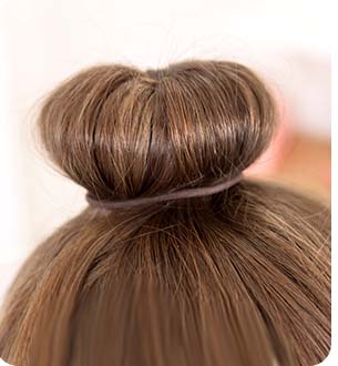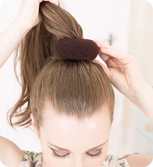 Przez związane włosy przekładamy wypełniacz w kształcie amerykańskiego pączka. Wypełniacze są dostępne w wielu różnych kolorach. Wybierzmy ten, który najlepiej odpowiada naszemu kolorowi włosów. Wtedy bowiem wypełniacz będzie mniej widoczny.