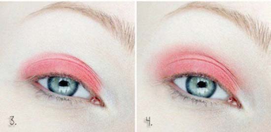 3. Na ruchomą część powieki, pomijając wewnętrzny kącik oczu, nanieś cień w kolorze koralowego różu.