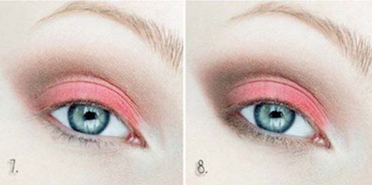 6. Czystym pędzelkiem delikatnie rozetrzyj granice między jasnobrązowym a koralowym cieniem.