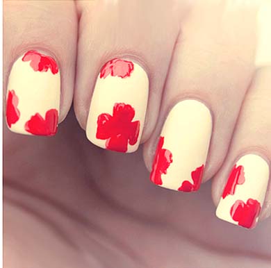 2. Namaluj na każdym z paznokci za pomocą czerwonego lakieru oraz ozdobnego pędzelka po 2-3 wzorki na kształt greckiego krzyża o nieco zaokrąglonych brzegach, tworząc płatki kwiatów.