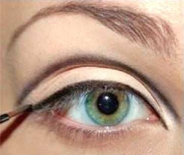 Najważniejsza w tym makijażu jest kreska nad górną powieką. Wykonujemy ją przy pomocy eyelinera w odcieniu czerni. Kreskę zaczynamy w wewnętrznym kąciku oka i ciągniemy wzdłuż łuku brwiowego do zewnętrznego kącika oczu.