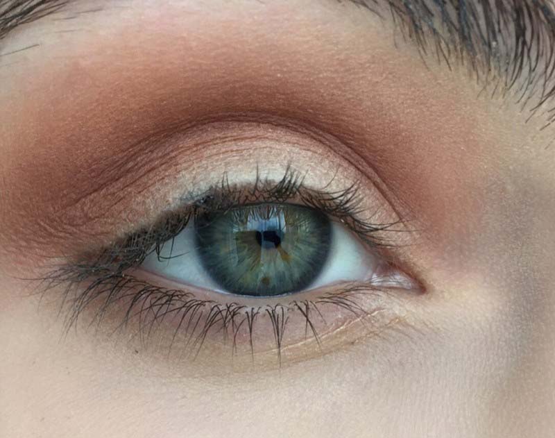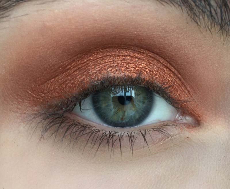 Teraz nakładamy najważniejszy kolor w naszym makijażu. Wybieramy miedziany, błyszczący cień do powiek. Nakładamy go na całą powiekę ruchomą.