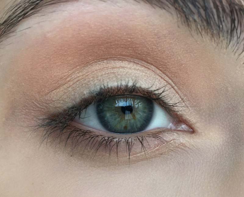 Cień w brzoskwiniowym odcieniu nakładamy na całą górną powiekę. Aby zrobić to precyzyjnie, używamy małego, puszystego pędzelka.