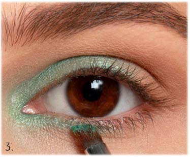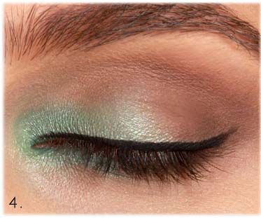 Na górną powiekę nakładamy miętowy, lekko połyskujący cień do powiek. Nakładanie powinnyśmy zacząć od wewnętrznego kącika powiek i zakończyć na środku powieki.