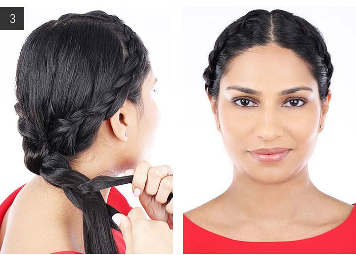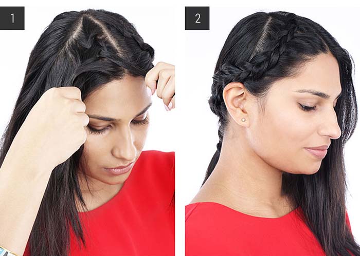 Zaczynamy pleść warkocz nad czołem na prawo i od przedziałka. Pleciemy cały czas tradycyjny warkocz z trzech pasem. W ten sposób długie włosy pleciemy bardzo szybko. Pleciemy warkocz z boku głowy i kontynuujemy aż do potylicy. Tuż nad karkiem zaczynamy pleść nasz warkocz luźno w dół.