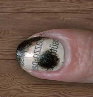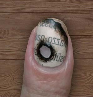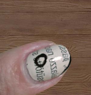 Teraz sięgnij po czarny lakier i pomaluj nim krawędzie paznokci. Na jednym z nich możesz namalować owalny lub kolisty kształt, który posłuży za dziurę w tekście. Pamiętaj, żeby nie zamalowywać go.