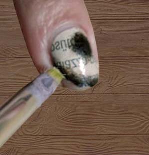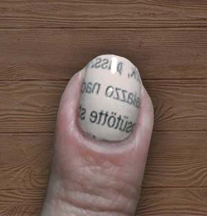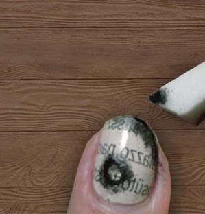 Do tego zadania najlepszy będzie pędzelek o skośnym włosiu. Zanurz go w zmywaczu do paznokci i delikatnie usuń nieco lakieru z krawędzi paznokci oraz z wnętrza owalnego kształtu. Dzięki temu jeszcze bardziej będą przypominały pożarte przez ogień strony książek.