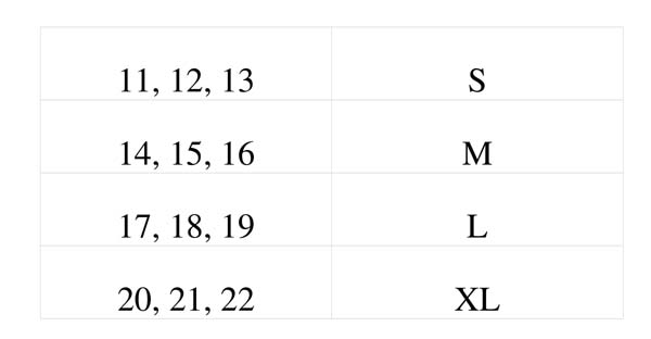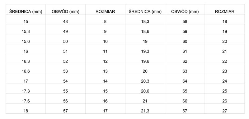Owiń palec nitką bądź tasiemką tak aby nie ściskała palca i jednocześnie się z niego nie zsuwała. Zaznacz miejsce, w którym tasiemka łączy się z końcówką. Rozwiń tasiemkę i zmierz jej zaznaczony fragment. Następnie sprawdź w tabeli, jakiemu rozmiarowi odpowiada obwód tasiemki.