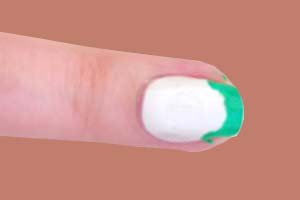 Końcówkę paznokcia, czyli cały obszar znajdujący się ponad naklejką pomaluj ciemnozielonym lakierem do paznokci. Następnie usuń naklejkę zanim ten zdąży wyschnąć ? dzięki temu unikniesz odprysków.