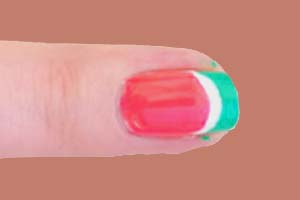 Gdy zielone elementy będą już suche, możesz przejść do kolejnego etapu zdobienia. Teraz sięgnij po lakier w kolorze koralowego różu i pomaluj nim paznokcie. Nie zamaluj przypadkiem całej powierzchni paznokcia. Pod zielonym paskiem powinnaś pozostawić biały, którego szerokość będzie zbliżona do poprzedniego fragmentu zdobienia.