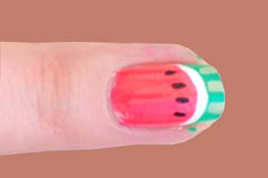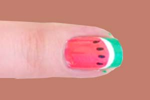 Każdy szanujący się arbuz powinien mieć pestki, pozostaje ci więc ozdobić nimi i swoje owocowe paznokcie. Poniżej białego paska namaluj kilka małych, czarnych owali. Pamiętaj tylko, żeby użyć do tego cienkiego pędzelka.