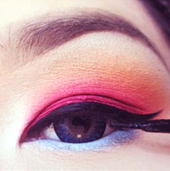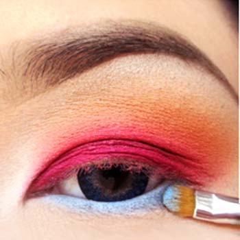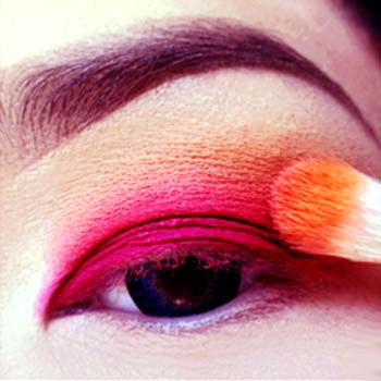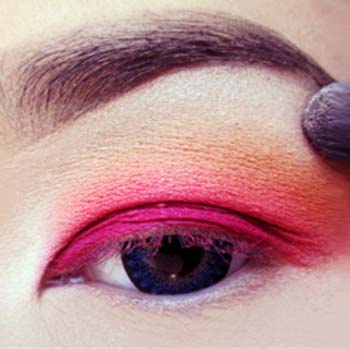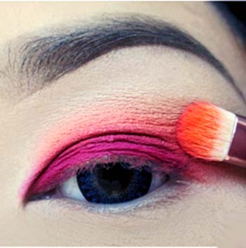 Intensywnie różowy cień do powiek nakładamy na cała ruchomą, górną powiekę. Do tego celu używamy miękkiego pędzelka.