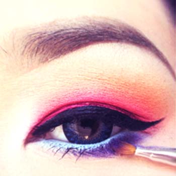 Pod błękitną kreską nakładamy fioletowy cień do powiek. Aby nie zagłuszać błękitu, fioletowy cień nakładamy jedynie od połowy linii rzęs. W ten sposób oba kolory będą się podkreślać. Robimy to przy pomocy małego, płaskiego pędzelka. Kolor możemy bardzo delikatnie rozetrzeć.